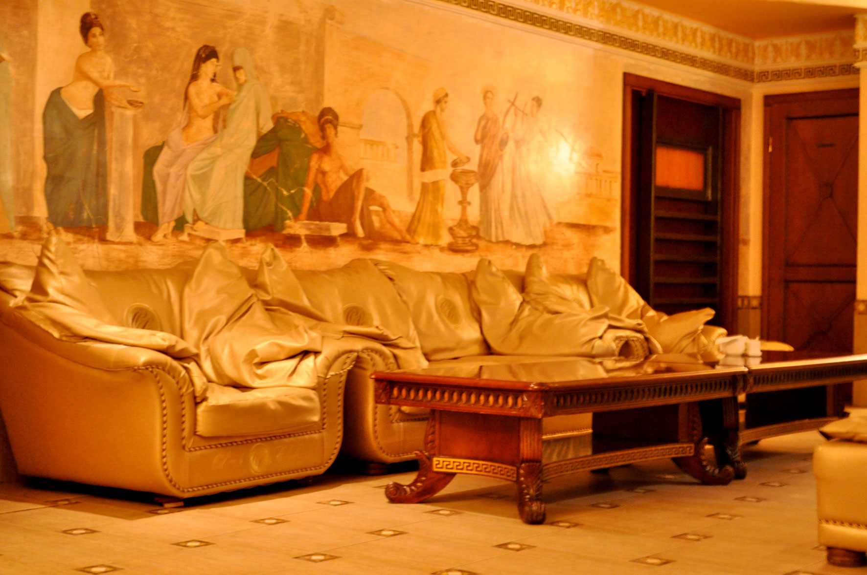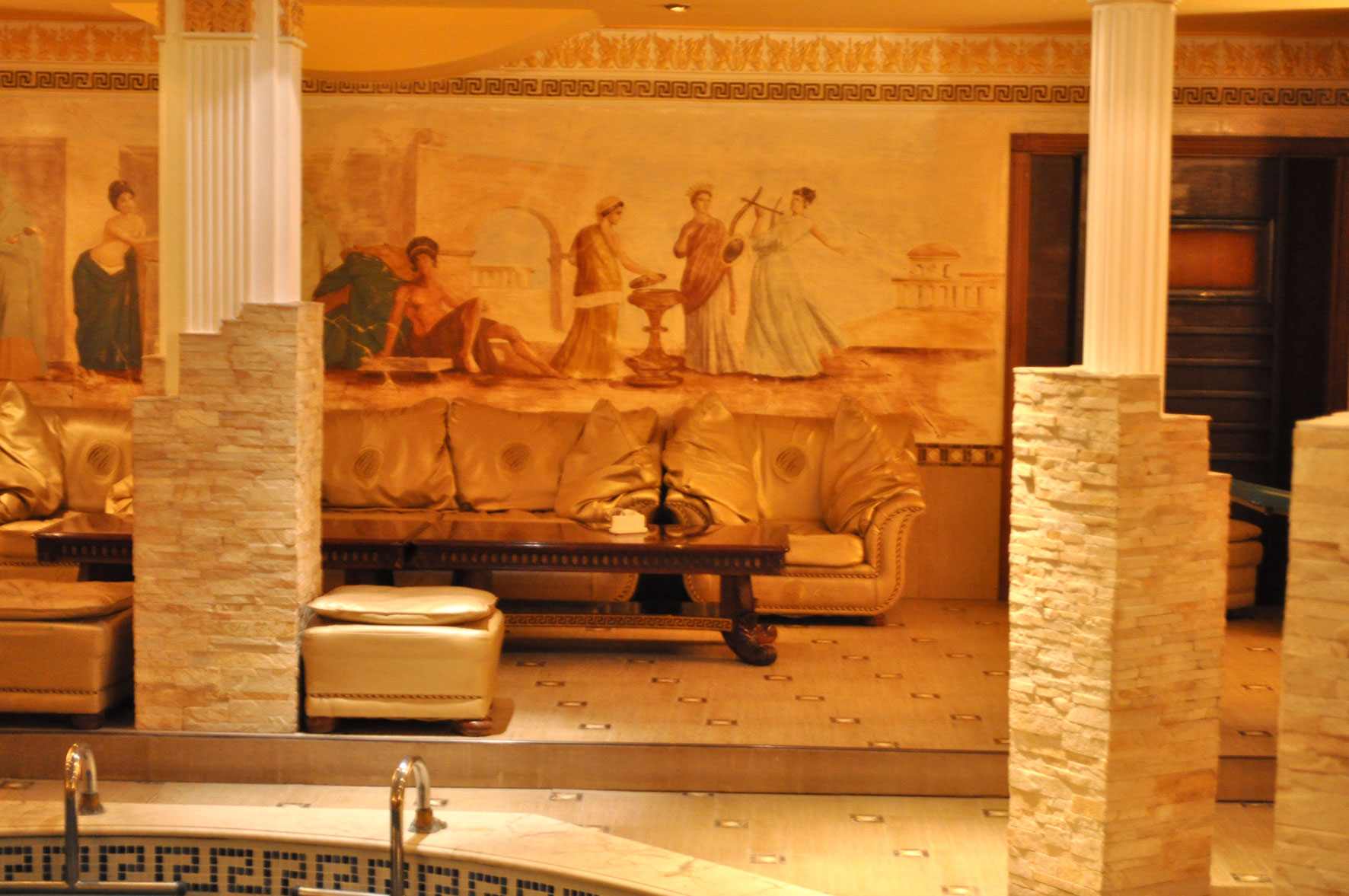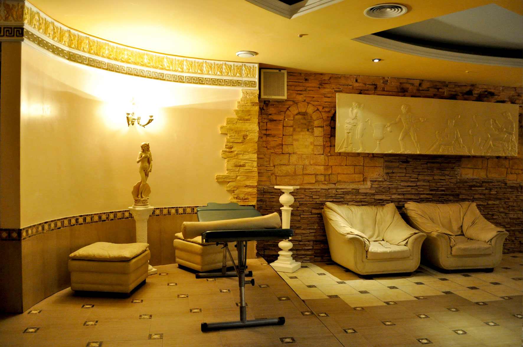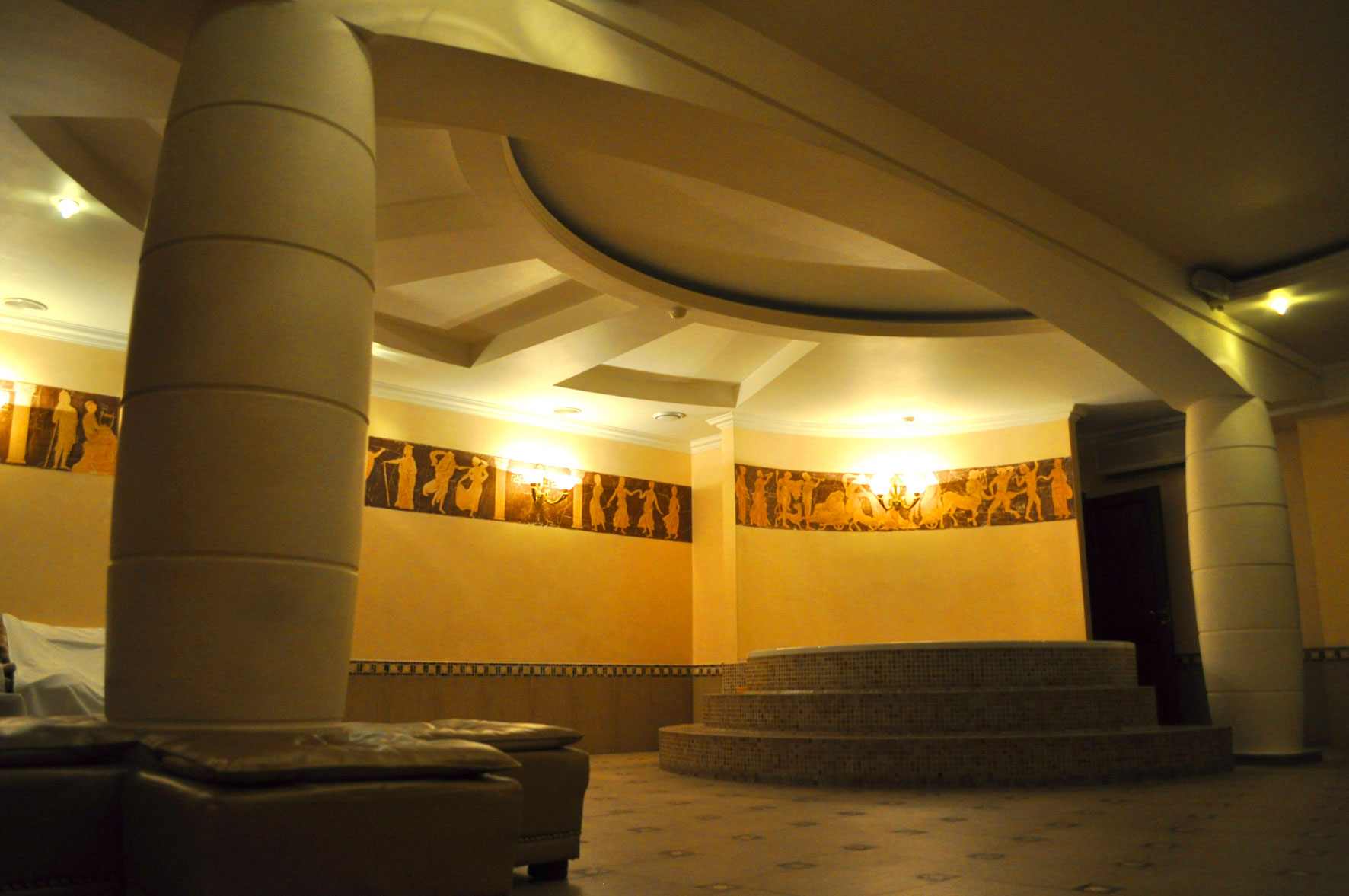 При создании оздоровительного комплекса большое внимание уделялось интерьеру и разработке соответствующего названию фирменного стиля. Все помещения отделаны натуральными материалами, стены украшены изысканными барельефами.