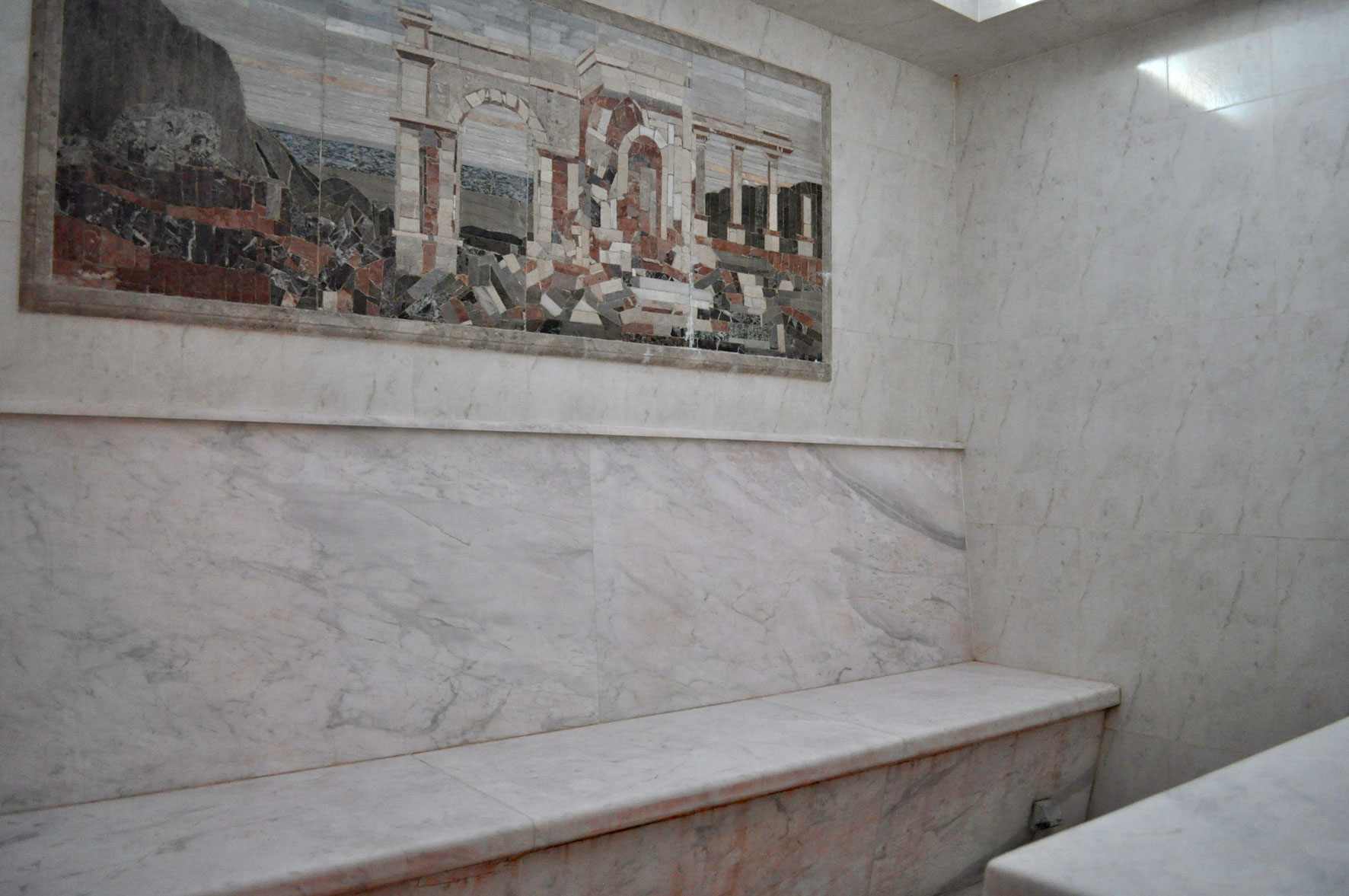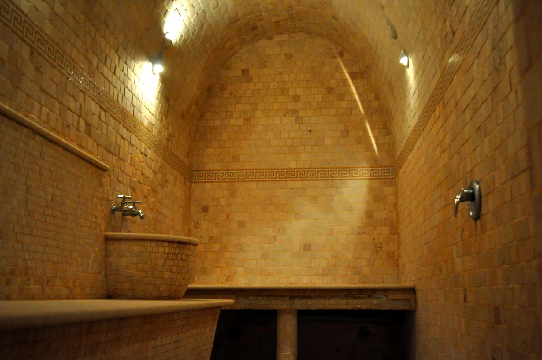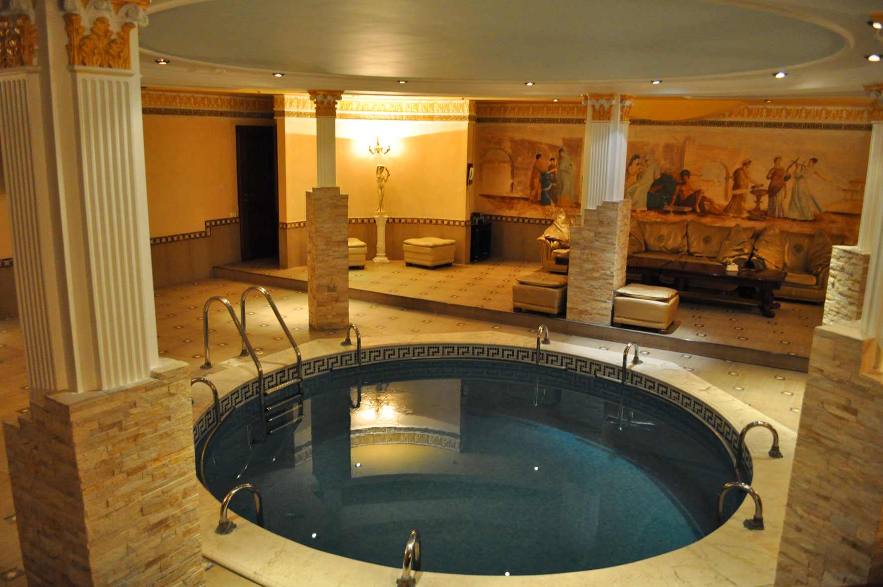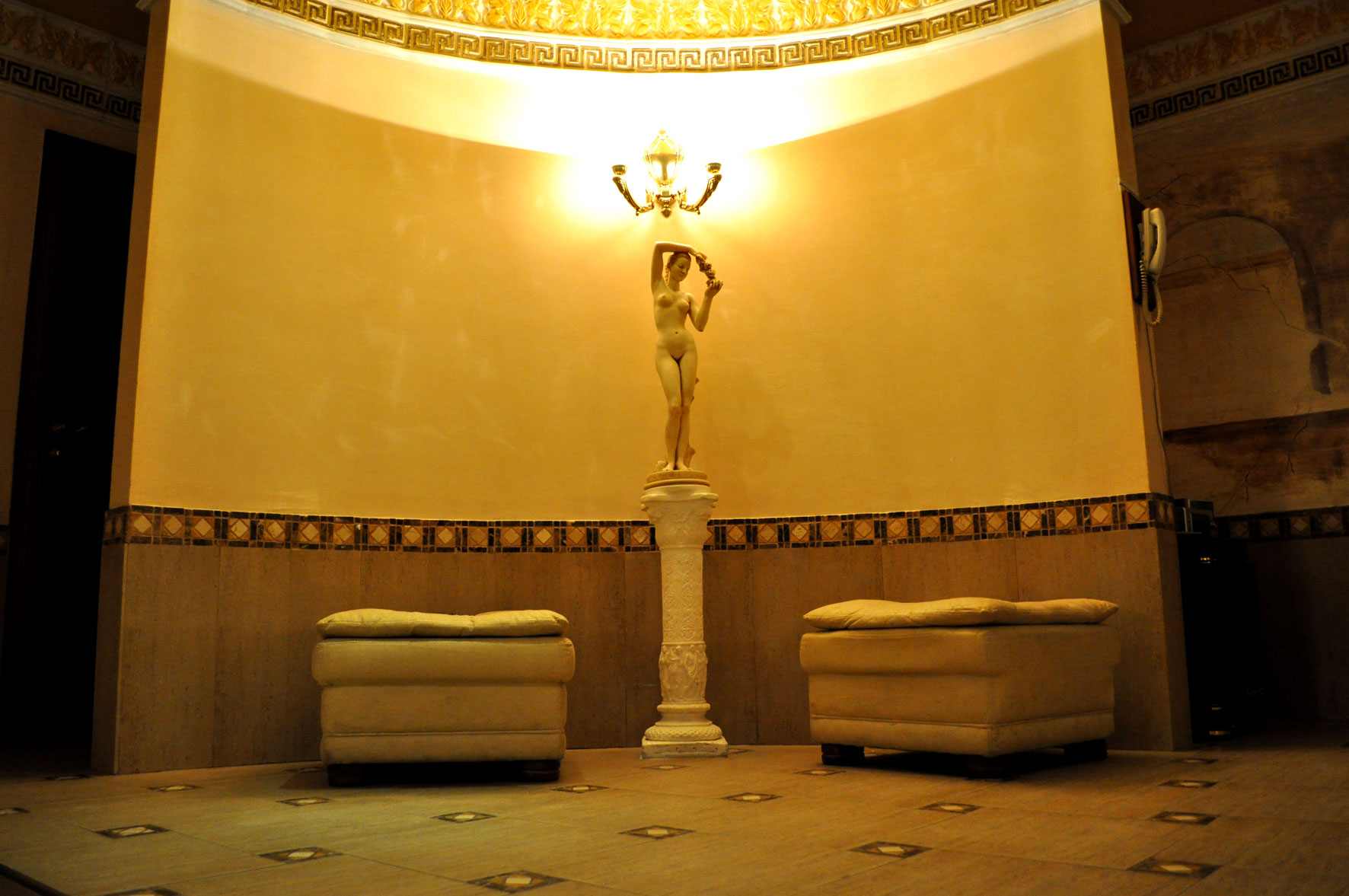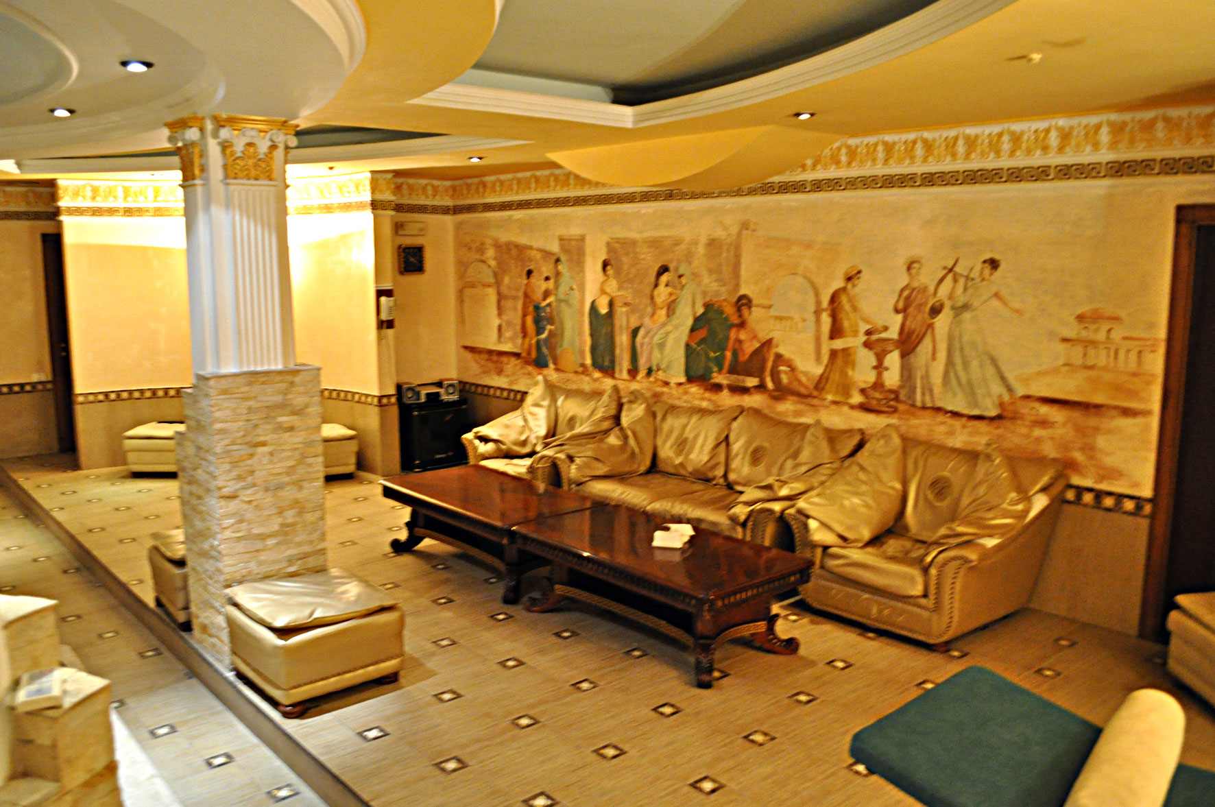 При создании оздоровительного комплекса большое внимание уделялось интерьеру и разработке соответствующего названию фирменного стиля. Все помещения отделаны натуральными материалами, стены украшены изысканными барельефами.